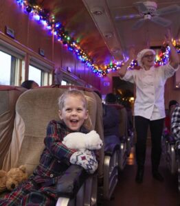 Once onboard, guests are served hot chocolate and a cookie treat by Polar Express Chefs, will be presented with a souvenir golden The Polar Express ticket, and each family houshold receives a ceramic souvenir mug at the end of their journey. Santa boards the train at the North Pole, and during the return trip walks through the cars giving out the “first gift of Christmas” – a silver sleigh bell.